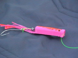 | D: passare il filo nel foro posteriore e farlo uscire dal foro anteriore. Prima del piombino è consigliato l'uso di due perline forate. Tirare il filo fino a quando il piombino o le perline forate incontrano il bordo posteriore del twisteen. |